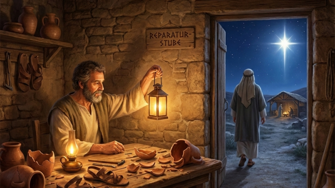 Das Licht in der Werkstatt der zerbrochenen Dinge Betlehem war in jener Nacht ein Ameisenhaufen. Die Volkszählung hatte die Stadt an ihre Grenzen gebracht; überall schrien Esel, feilschten Händler und ❖ Weiter ►